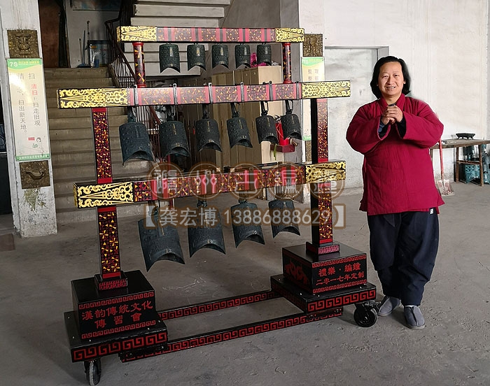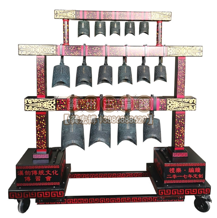 合肥漢韻文化傳習會定制的15件3層編鐘長1.9米、高1.86米、寬0.5米,音律齊全,演奏使用方便,木架上可以彩繪客戶定制文字或圖案,底部安裝鋼制滑輪,安裝移動都非常方便,配有樂器標準航空箱,外出表演得心應(yīng)手。