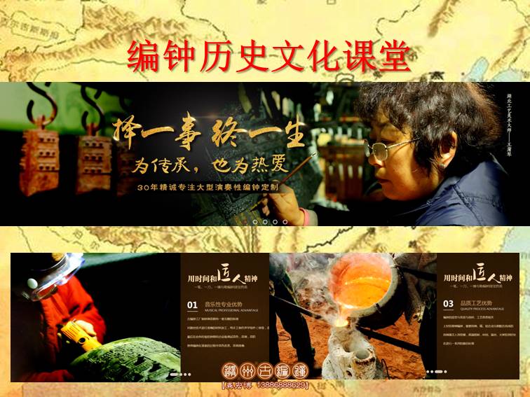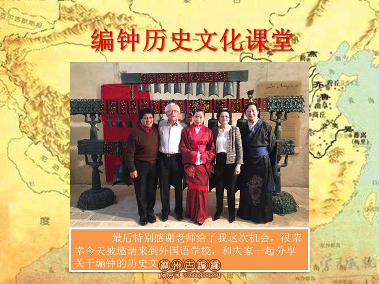 序:同學(xué)們,大家好!我是編鐘文化傳承人龔宏博,從我的父輩起就開(kāi)始從事編鐘的復(fù)仿制工作,如今已有快30年了,感謝謝老師給了我這次機(jī)會(huì),很榮幸今天被邀請(qǐng)來(lái)到    學(xué)校,和大家一起分享關(guān)于編鐘的歷史文化。
